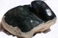 This is one large very dark black boulder of Guatemalan Jadeite. It has a combination of Black with dark green streaks running through it. Great natural roundish shape not flat with a lot of volume. This piece looks very solid..